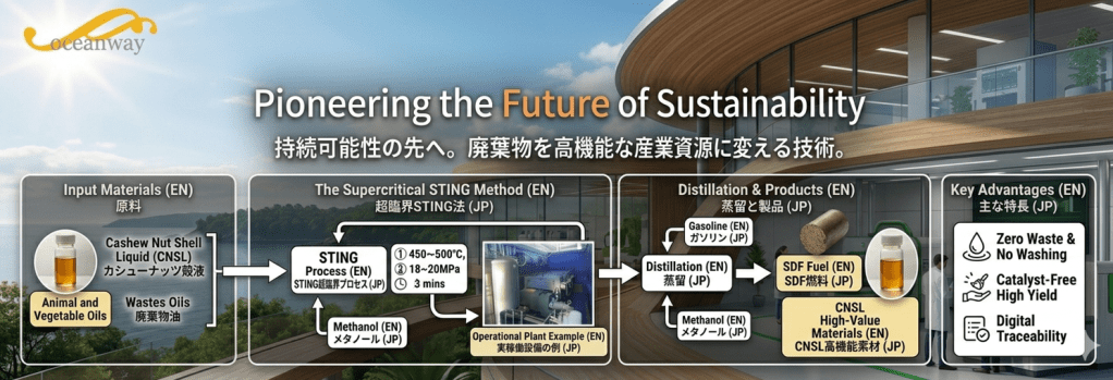 独自のSTING法は、触媒を一切使用せずに高品質なバイオディーゼル(SDF)を製造し、環境負荷を劇的に低減します。